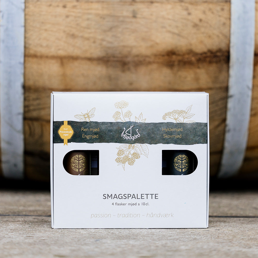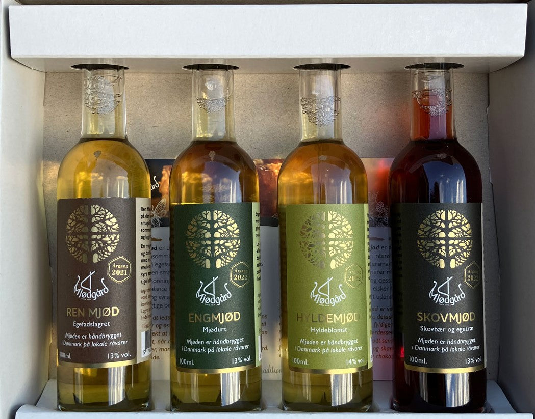 Æsken er både elegant og informativ, med små beskrivelser af hver variant, som gør den til en oplagt gave til værten, til mærkedage eller bare fordi. Her får du fire forskellige smagsoplevelser: Hyldemjød, Skovmjød, Engmjød og Ren Mjød – hver med sin egen unikke karakter og serveringsmuligheder.