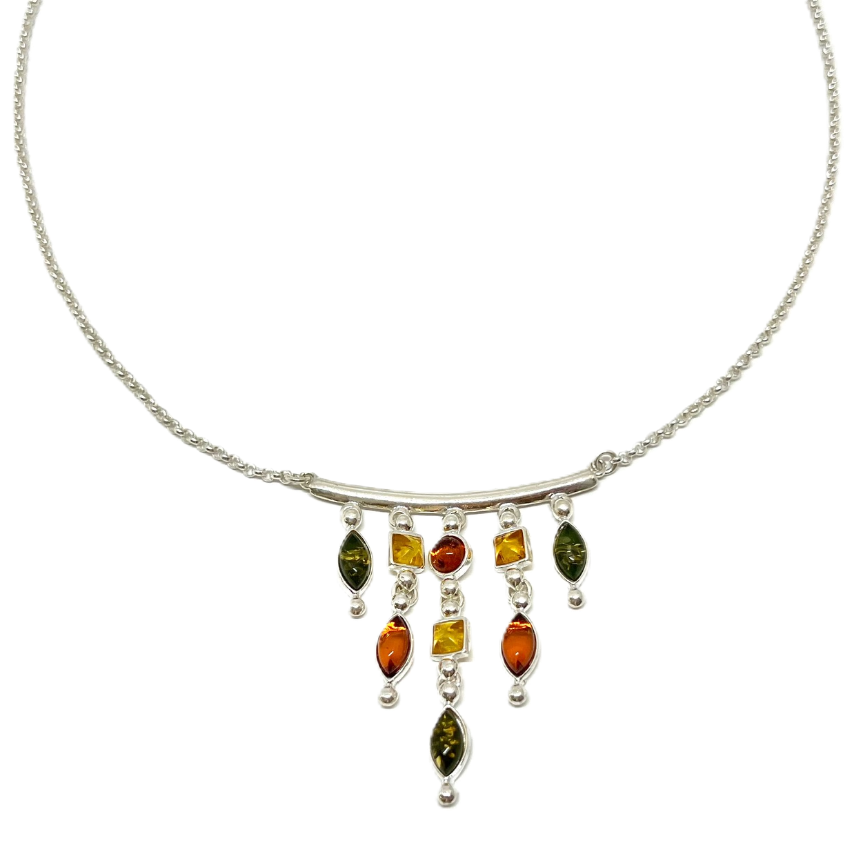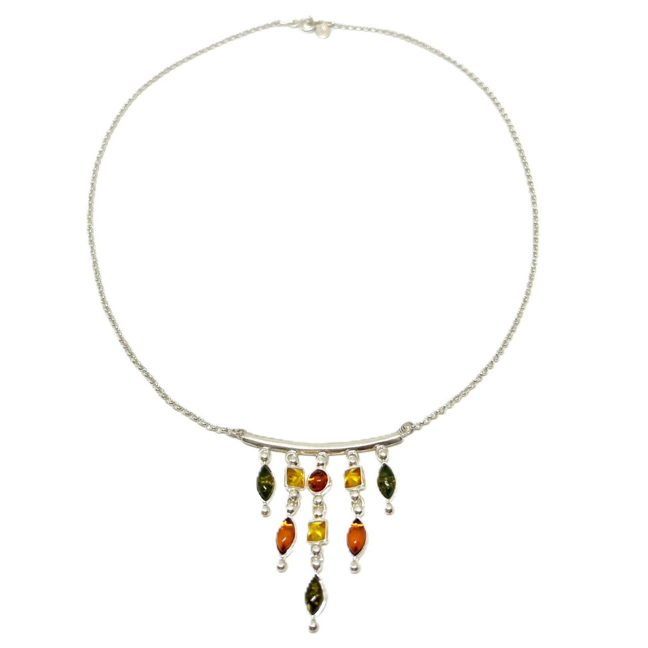 Smuk og elegant collie i sterlingsølv med cognac, gul og grøn rav.