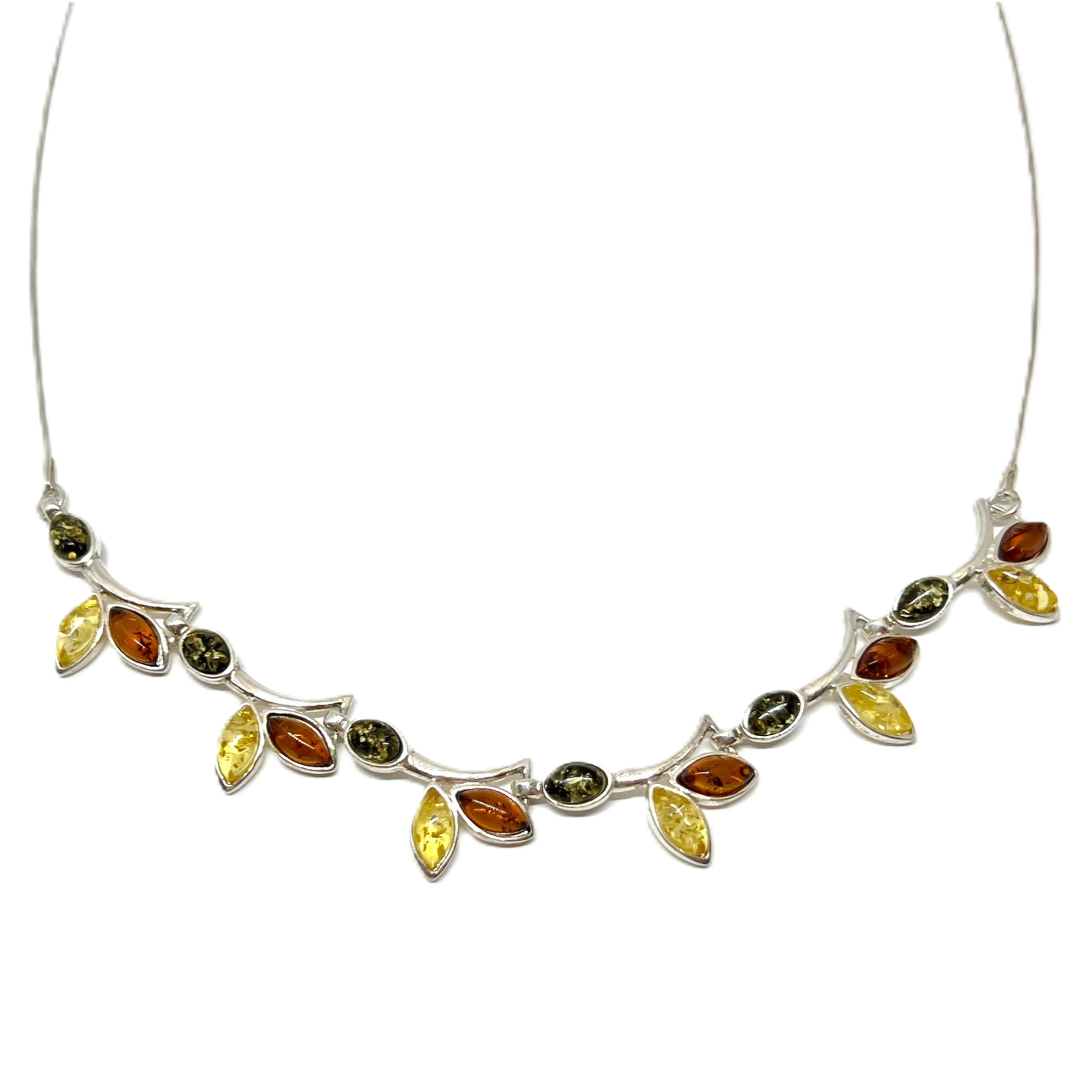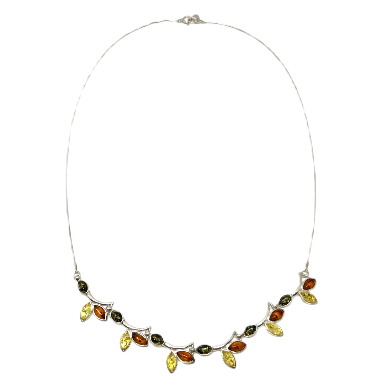 Smuk og elegant collie i sterlingsølv med cognac, gul og grøn rav.