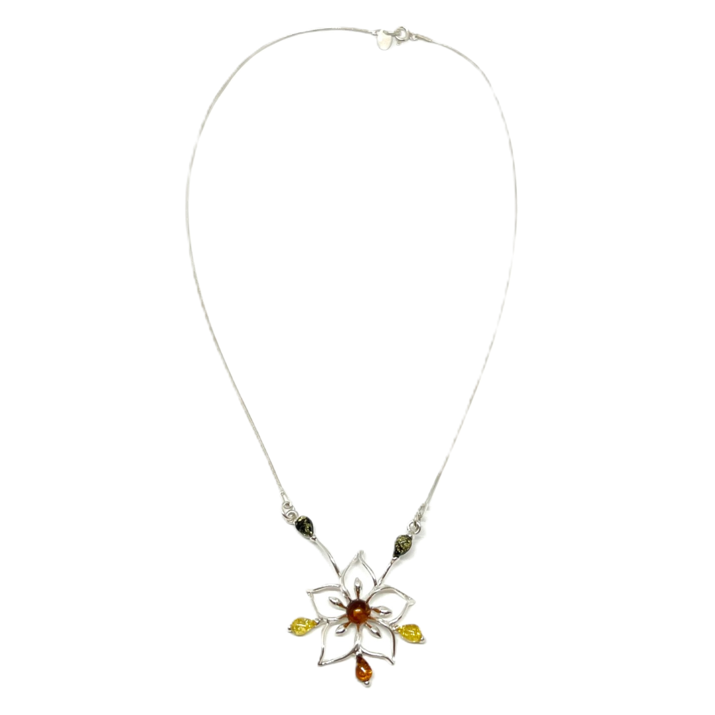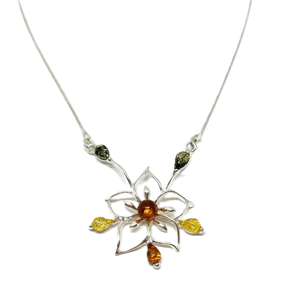 Smuk og elegant collie i sterlingsølv med cognac, gul og grøn rav.
