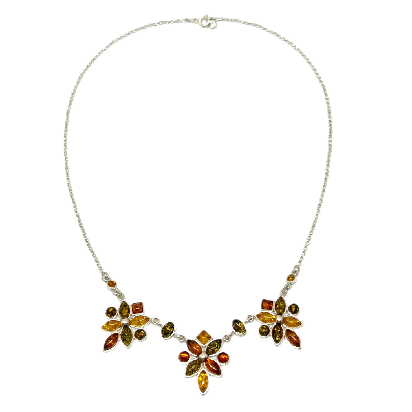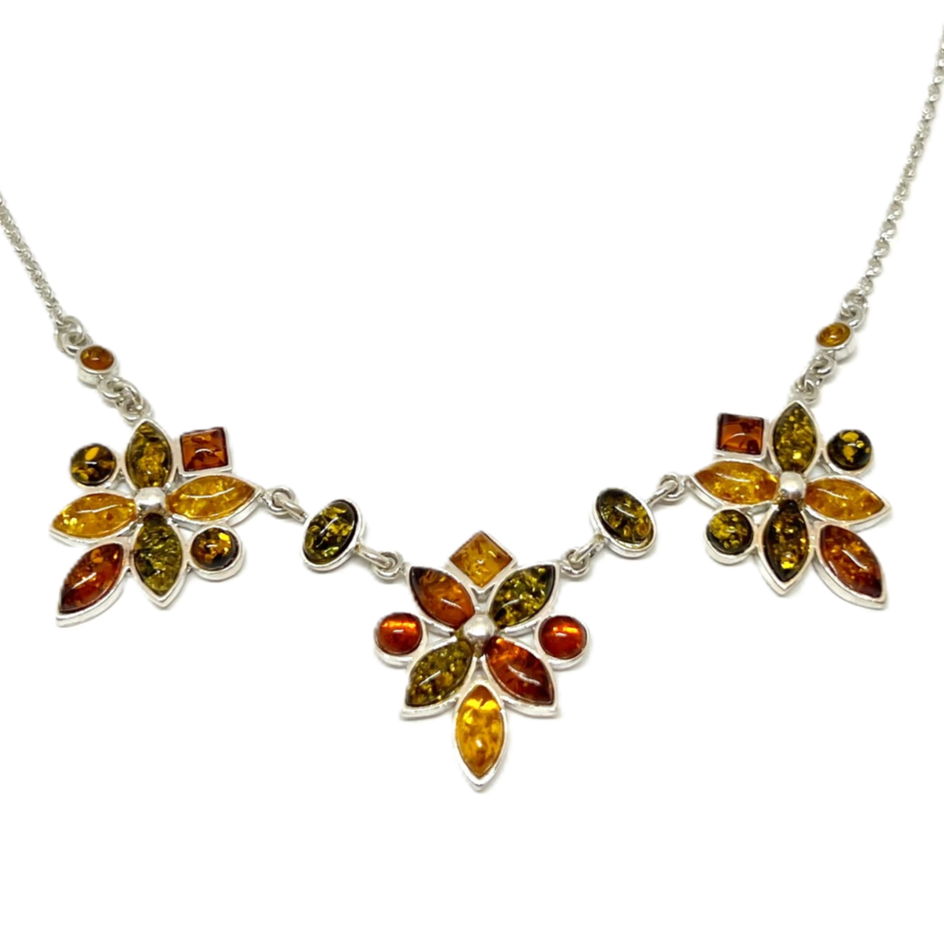 Smuk og elegant collie i sterlingsølv med cognac, gul og grøn rav.