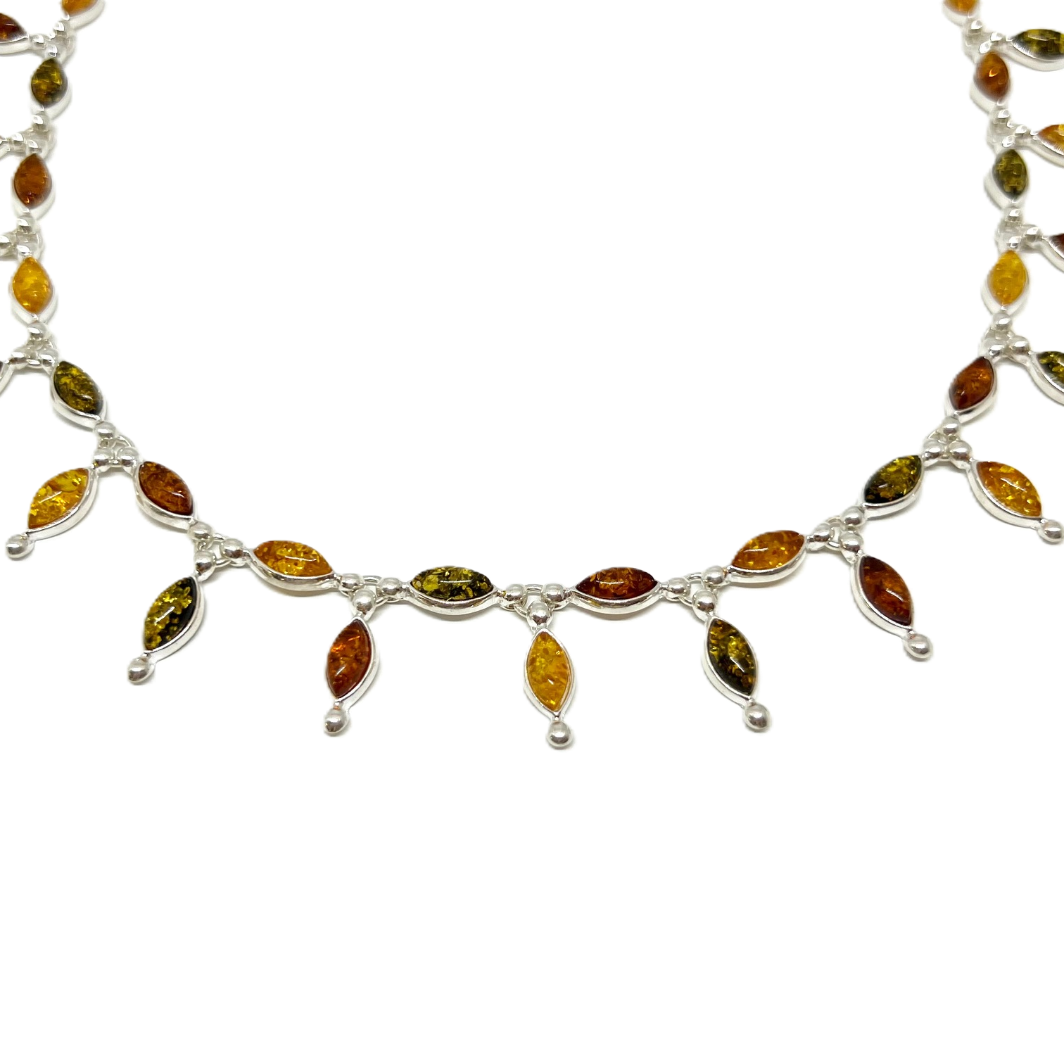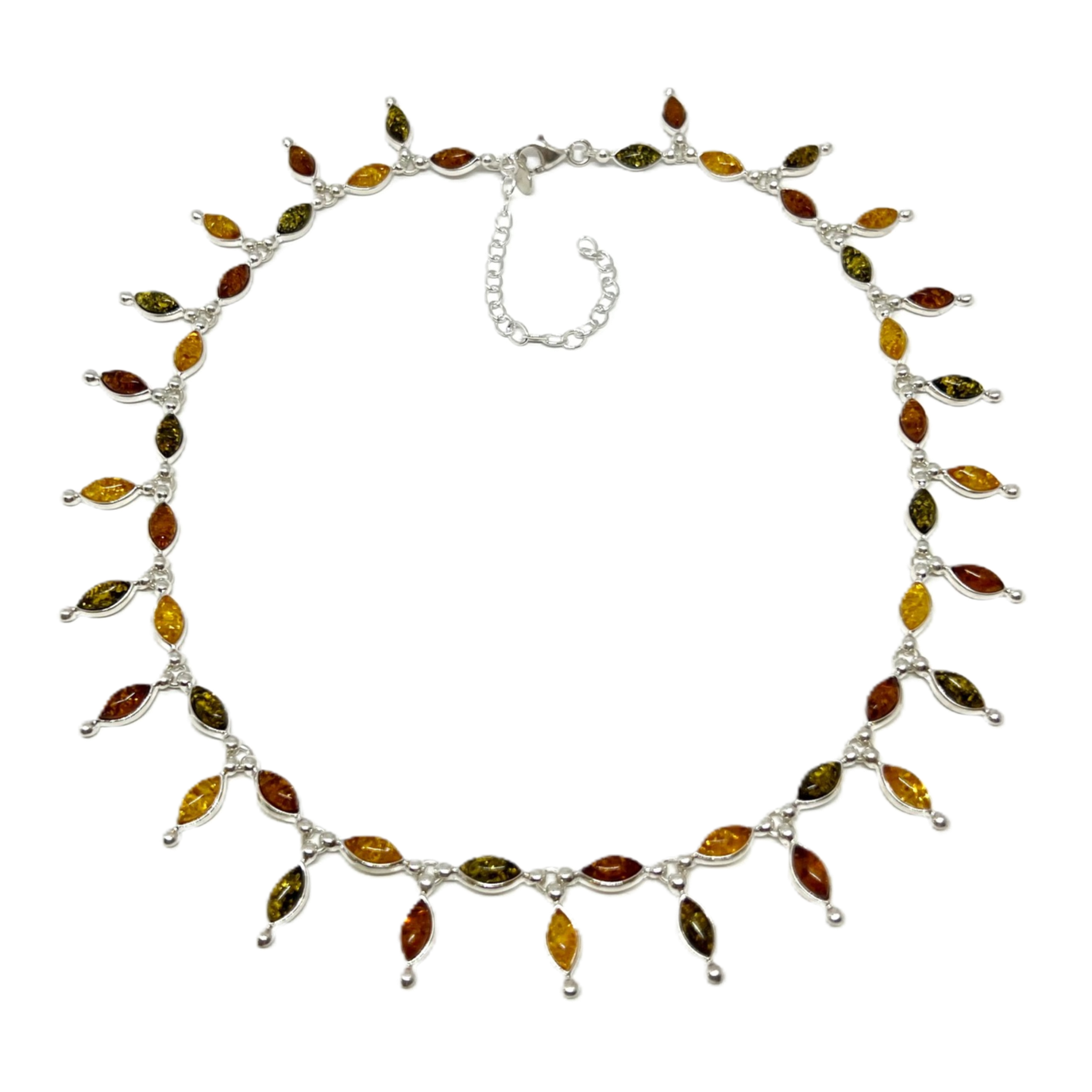 Smuk og elegant collie i sterlingsølv med cognac, gul og grøn rav.