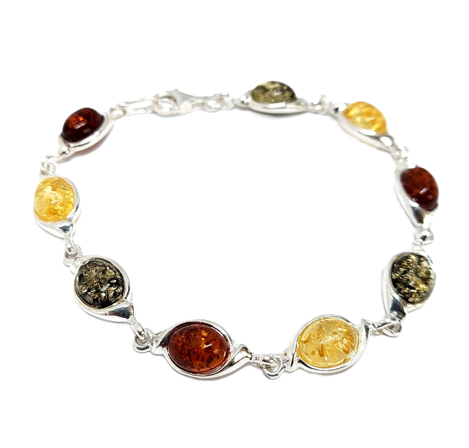 Smuk og elegant armbånd i sterlingsølv med 8x 9x7 mm grøn, cognac og gul rav.